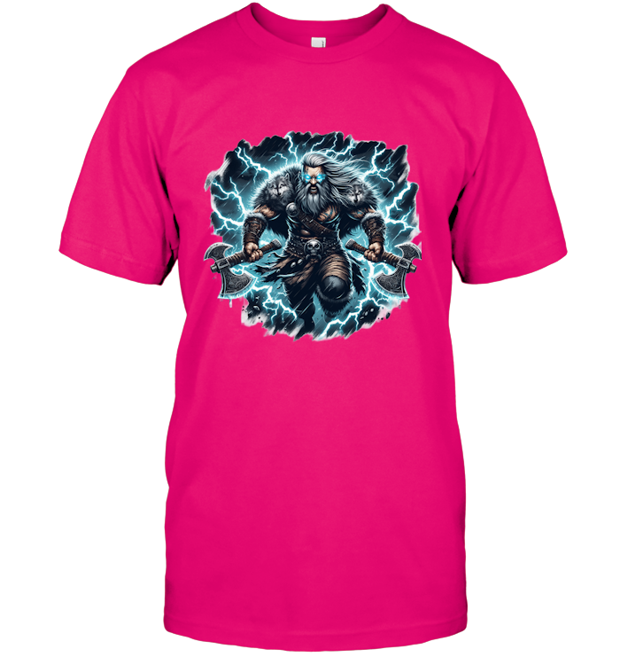 Unleash the fury of the storm with Stormborn Berserker! This electrifying design features a battle-hardened Viking warrior, his eyes glowing with raw power as lightning crackles around him. Wielding twin axes and flanked by his loyal wolves, he charges forward, ready to carve his path through the chaos of battle. A symbol of strength, rage, and the unbreakable spirit of the Norse berserkers, this T-shirt is perfect for those who embrace the storm and fight with honor.