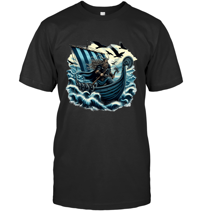 Set sail into legend with Warrior of the Seas! This epic design features a fierce Viking warrior standing tall on his longship, gripping his battle axe as powerful waves crash beneath him. With ravens soaring overhead and the call of adventure in the wind, this T-shirt embodies the fearless spirit of the Norse seafarers who conquered the unknown. Perfect for those who embrace strength, courage, and the thrill of the open sea.